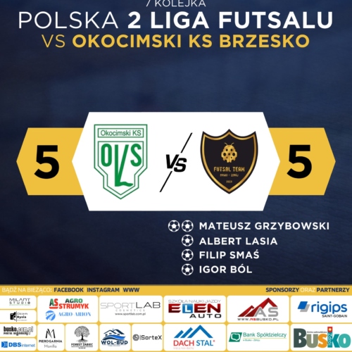 W 7. spotkaniu Polska 2 Liga Futsalu dzielimy się punktami z Okocimski KS Brzesko, remisując 5:5 po niezwykle emocjonującym widowisku. Ofensywny futsal i wysoka intensywność Od pierwszych minut tempo meczu było bardzo wysokie. Obie drużyny grały odważnie w ataku,