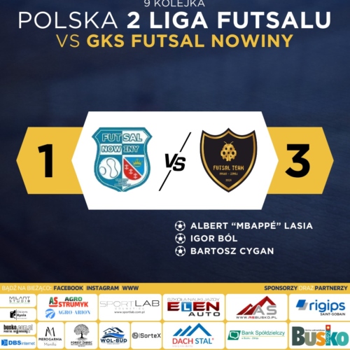GKS Futsal Nowiny – FUTSAL TEAM Busko-Zdrój 1:3 W 9. kolejce Polska 2 Liga Futsalu sięgamy po kolejne cenne zwycięstwo! Na trudnym terenie pokonujemy GKS Futsal Nowiny 3:1, potwierdzając swoją wysoką dyspozycję w obecnym sezonie. 💪⚽ Dojrzałość i konsekwencja