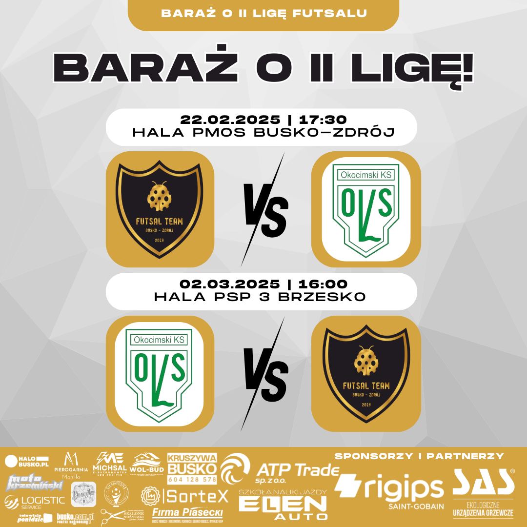 Przed nami najważniejsze mecze sezonu! 🔥 Futsal Team Busko-Zdrój zmierzy się w dwumeczu barażowym z Okocimski KS Brzesko, a stawką będzie awans do II Ligi Futsalu! 🏆